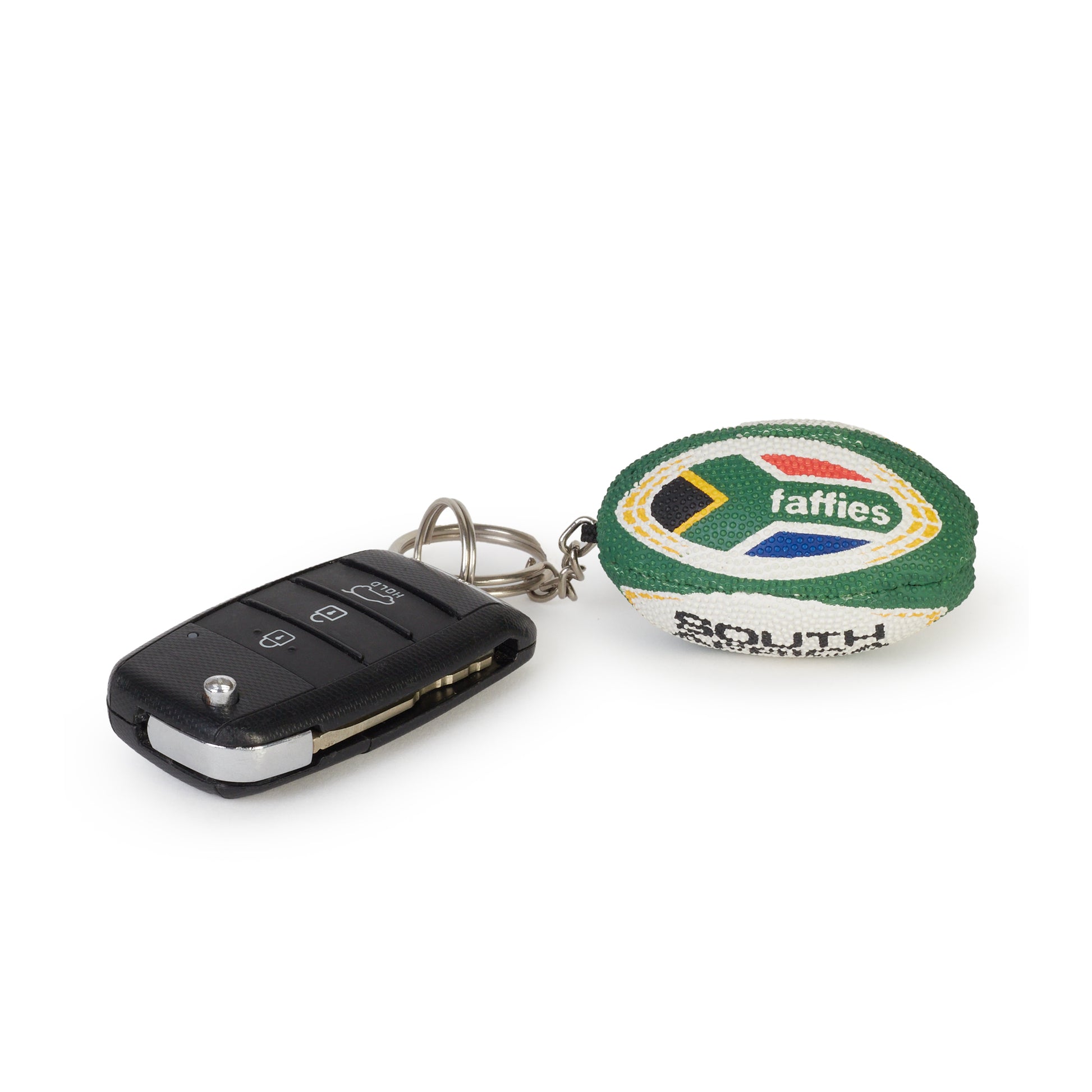 Carry the spirit of SA rugby wherever you go with our miniature Faffies x South African flag replica ball key ring.