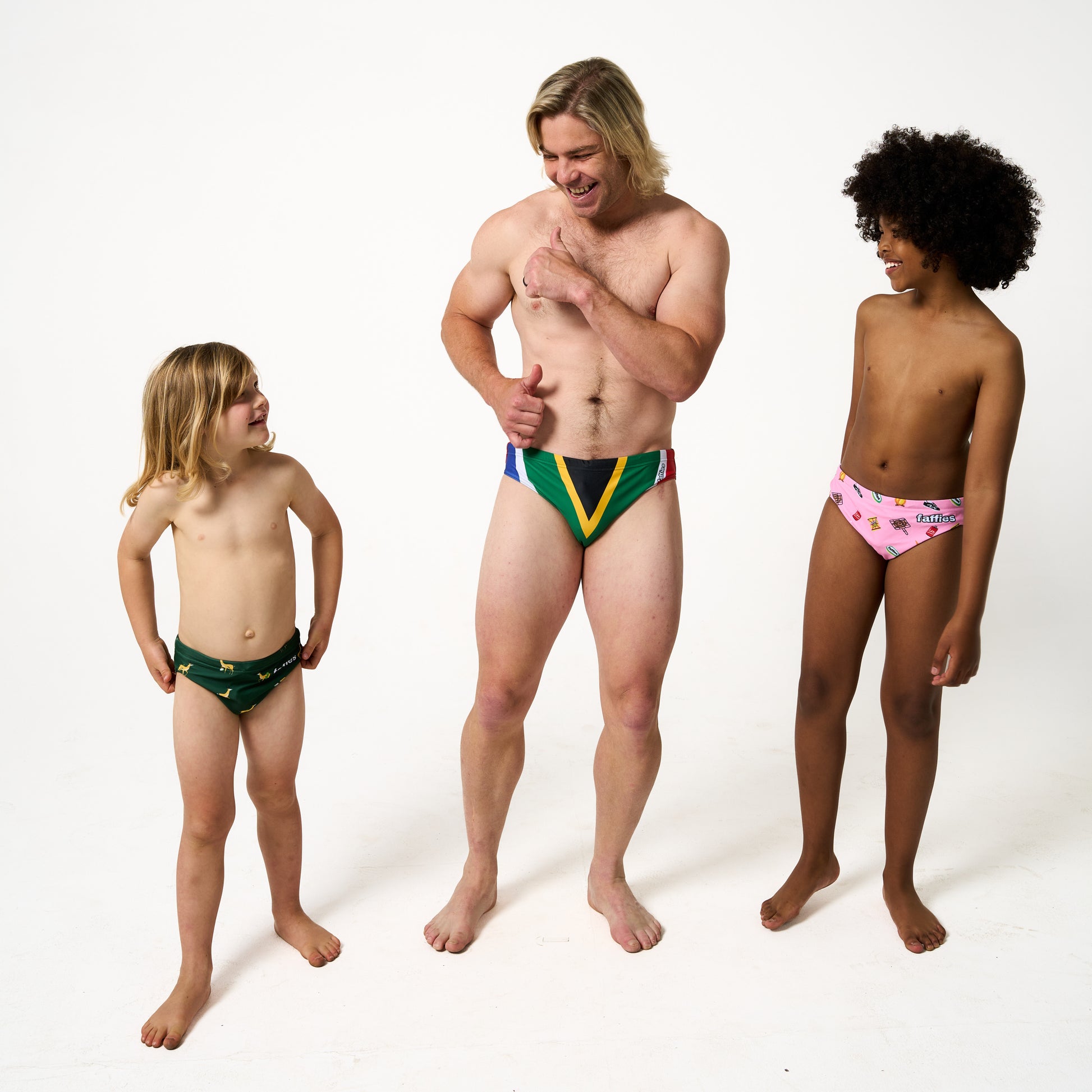 The gold and green "Bokkie" swim brief brings the spirit of South African rugby to your home. Crafted from high-quality fabrics and prints, each piece is designed and produced in South Africa.